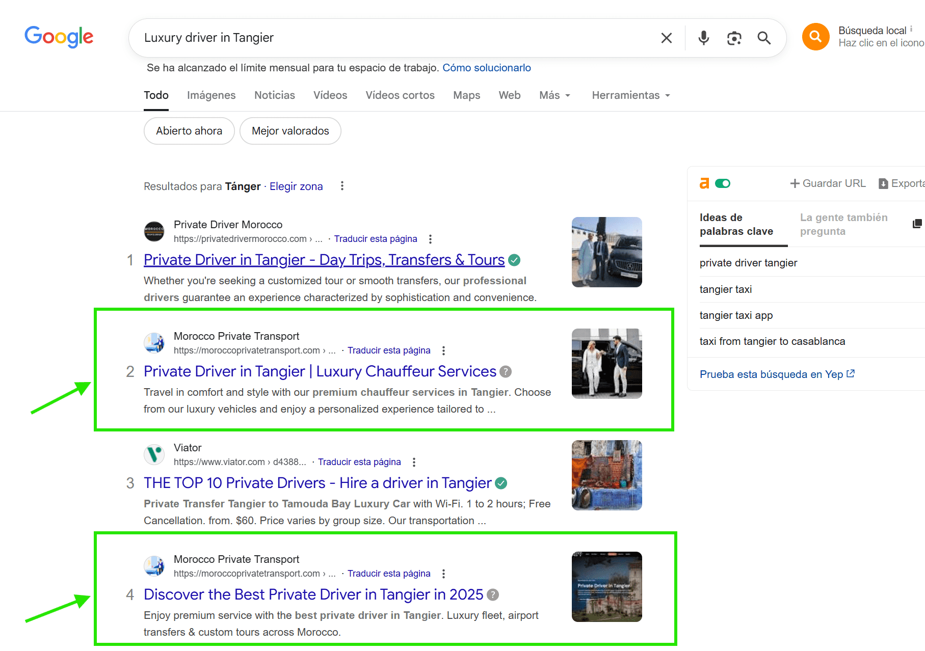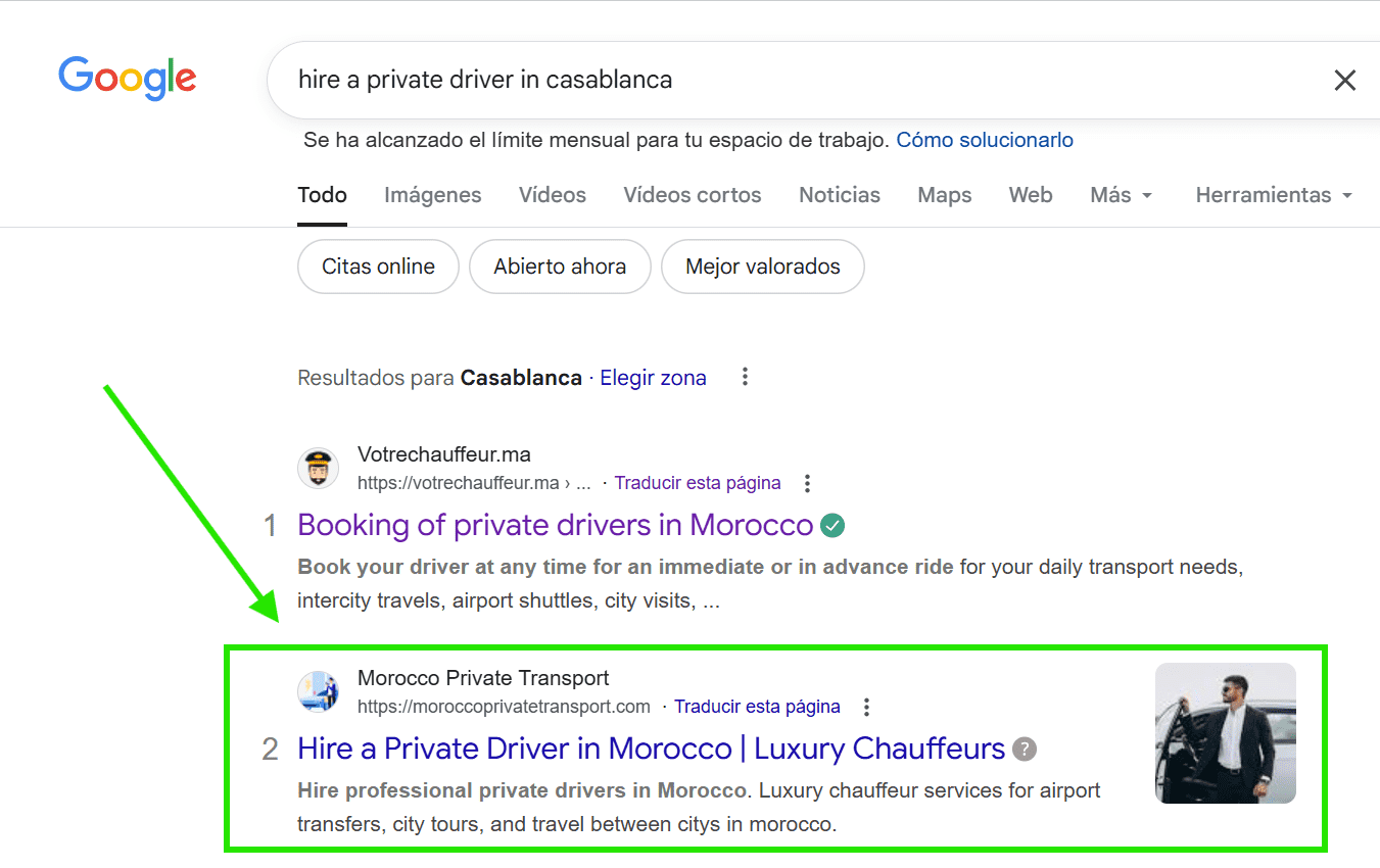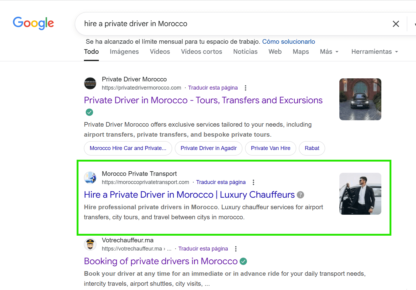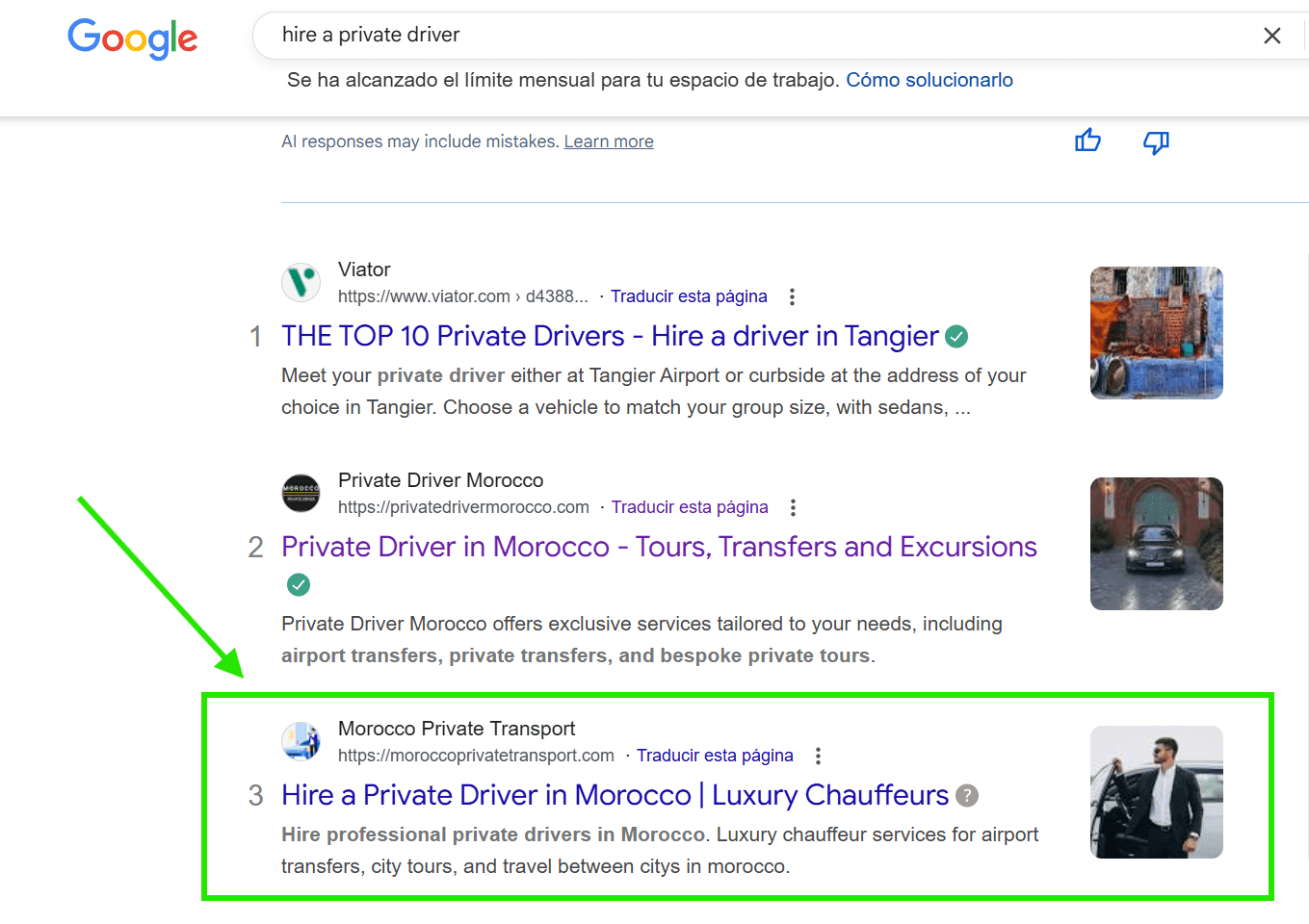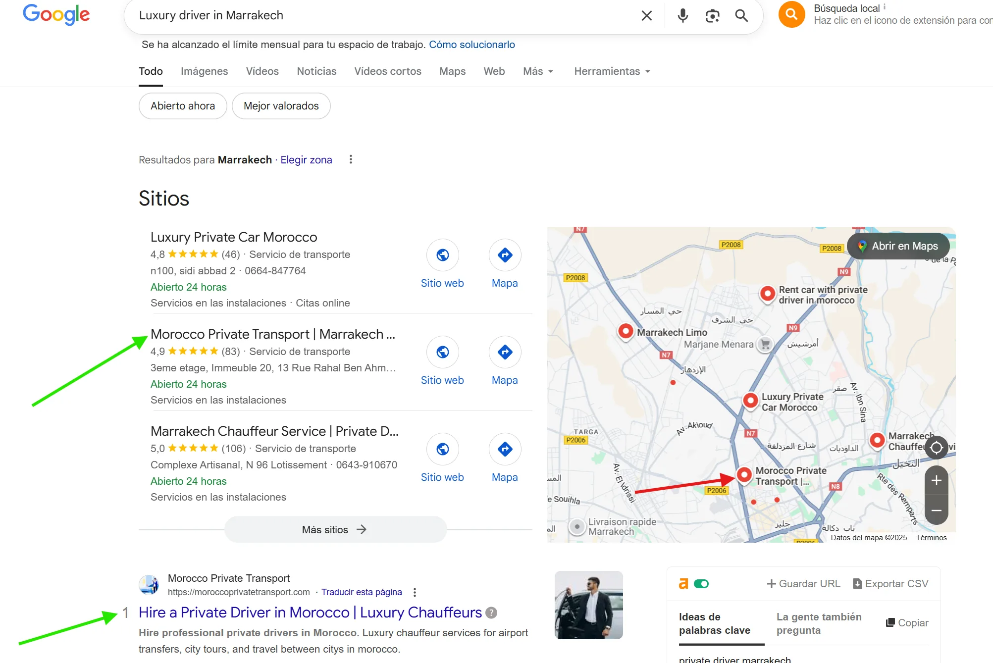 Morocco Private Transport, a private driver service company in Morocco, approached One Prose to improve their visibility on Google Maps. After seeing significant results, they opted for a website that now ranks in the top three in several Moroccan cities with keywords related to their services.